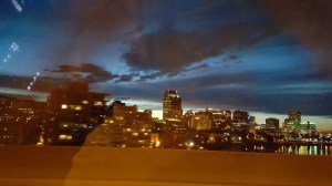 | Driving through Portland at sunset. We should have seen this with more light in the sky… much more. |