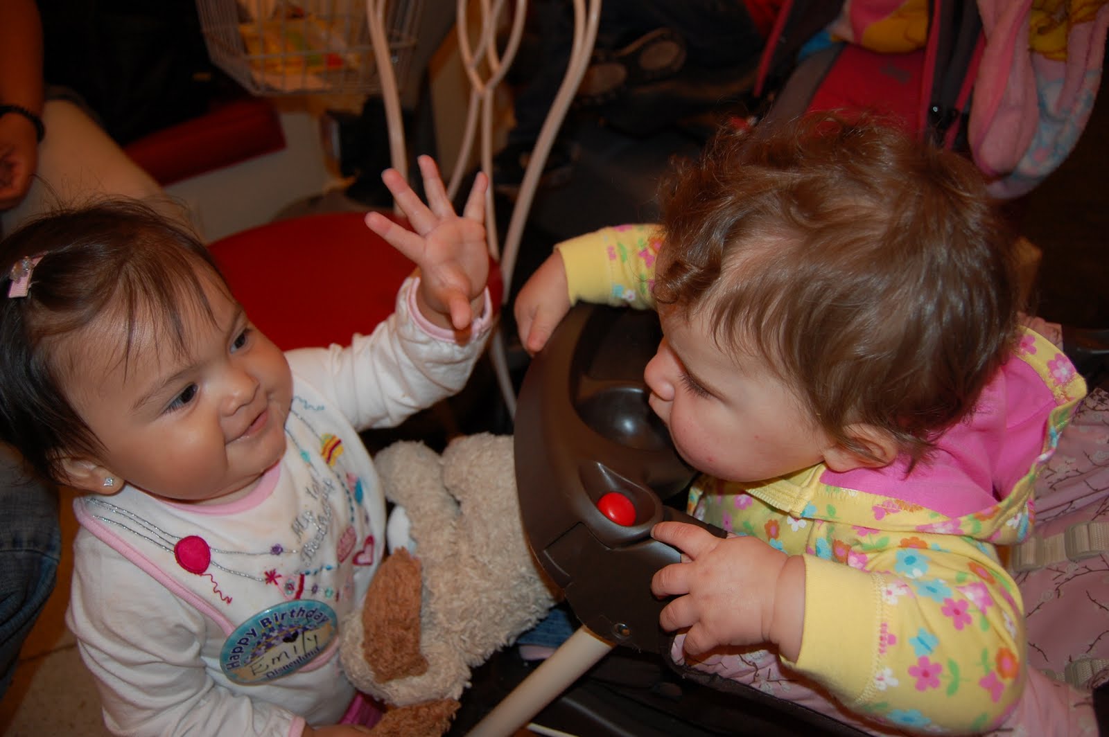 After dinner we were finally able to meet up with Emerson, Jackie, Matthew, Jacob and of course the birthday girl… Emily! She and Abby had some time to get to know one another and it was too cute. I think Abby tried to kick Emily and Emily almost bit Abby but hey… thats what happens when you are little. They also giggled and chattered at one another, so I think this will be the beginning of a beautiful friendship.