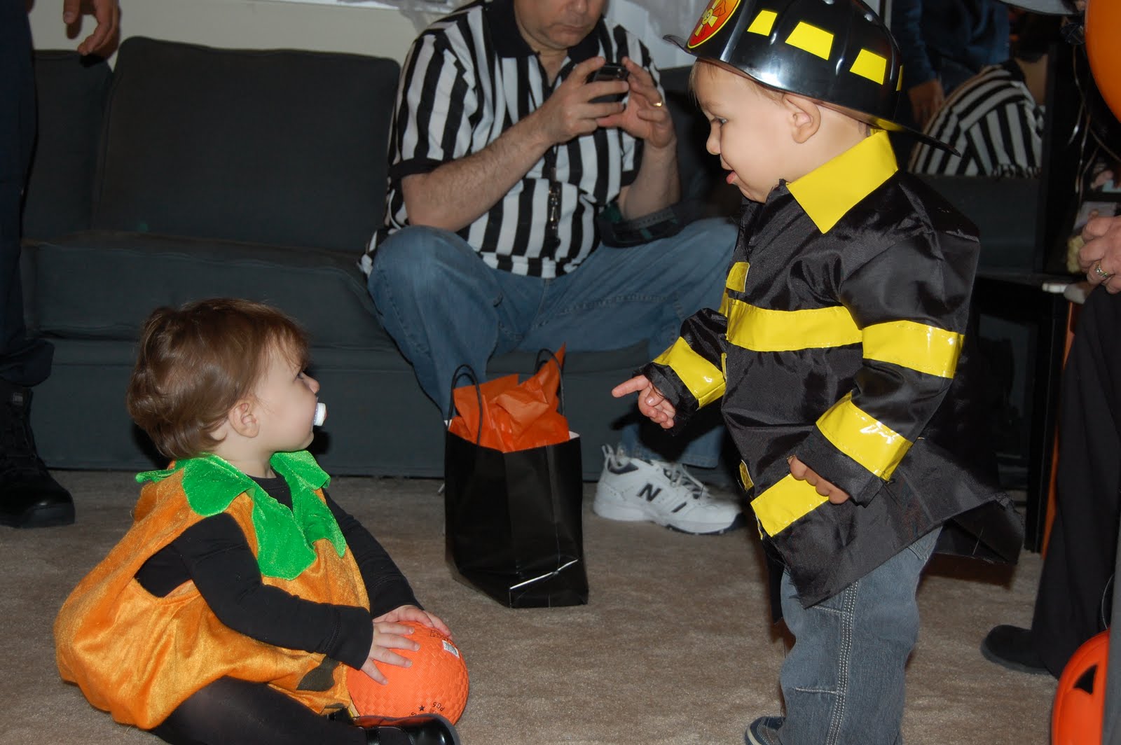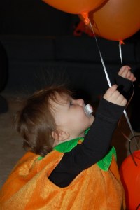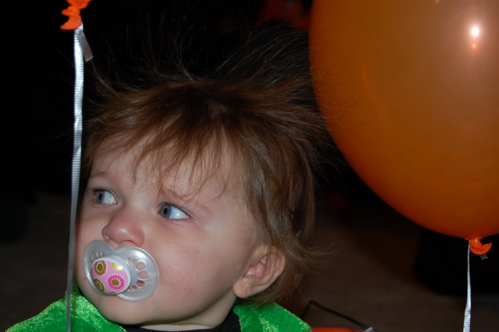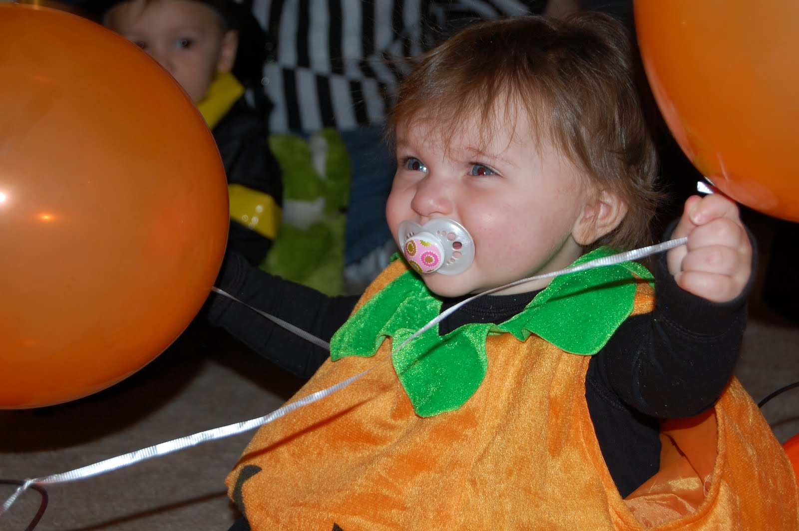 We knew Abby was still too young for Trick Or Treating, but luckily her friend Harrison and our friends Byron and Erika were having a Halloween Party and we were invited! We had a wonderful time and Abby seemed to be having a fun time hanging out with Harrison and well, the balloons. Erika did an amazing job! She made the cake herself and the treats and food were amazing… all Halloween themed. Ghost Toast, Graveyard 6 layer dip, and much much more.