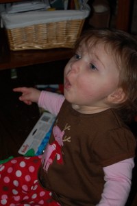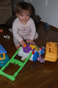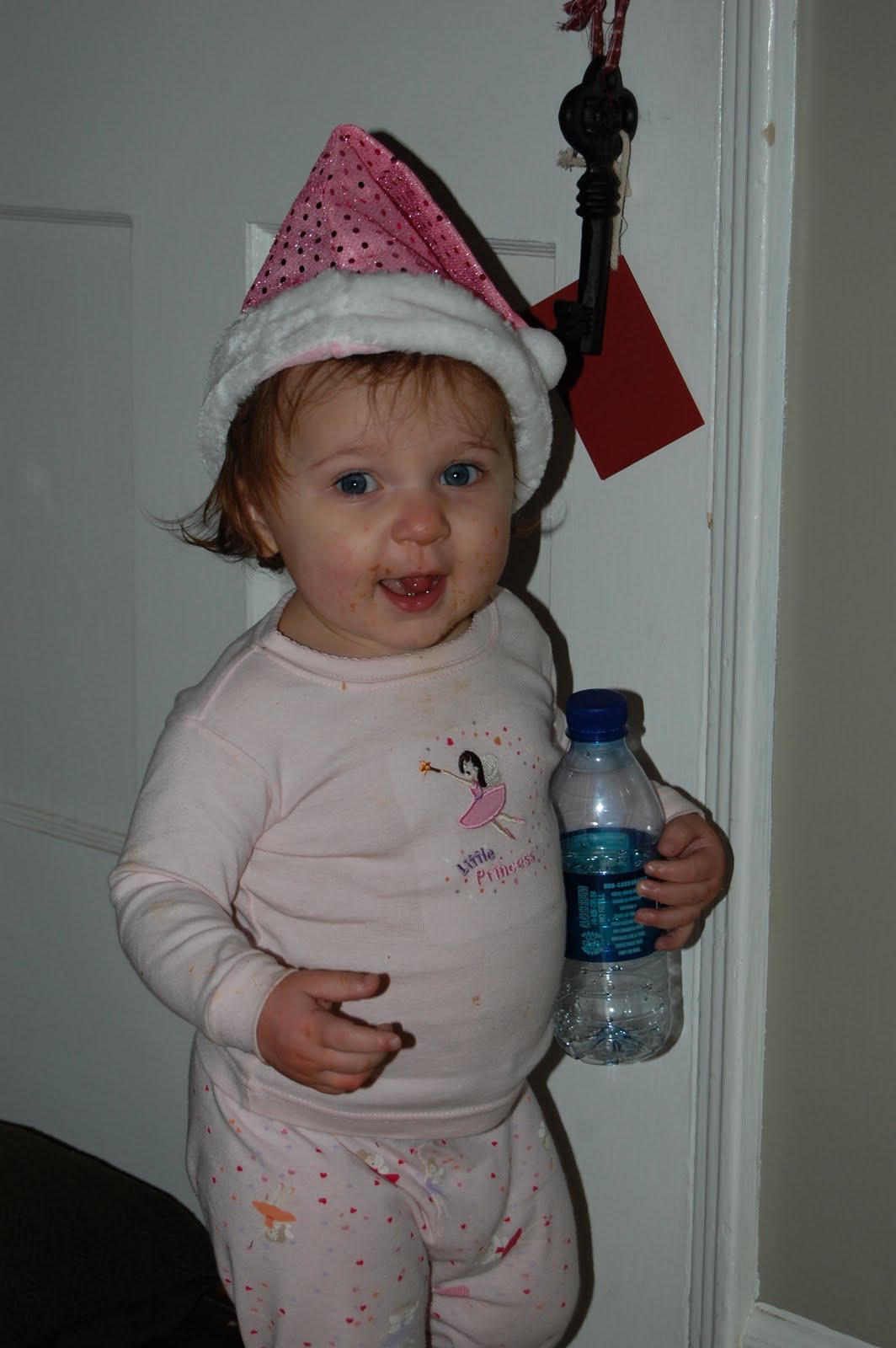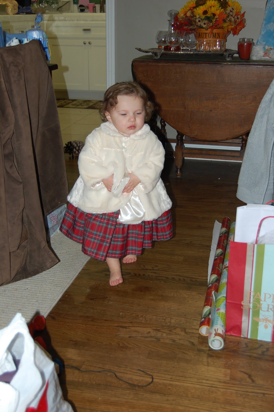 The weeks following flew by and as always the holiday season passed quickly. Before we knew it, Christmas Eve was upon us and we were off to Mary and Tom’s for their annual Christmas Eve party. Abby had on her beautiful Christmas dress and a very special coat from Great Grandma Prueter and I swear she looked like a little Shirley Temple. Unfortunately we arrived late and all of the commotion had Abby a little out of sorts, so we could not stay long, but we had a wonderful time none the less. Afterward, we went over to Grandpa Patrick and Nana Fionas to open presents and enjoy the remaining hours of Christmas Eve and the first few of Christmas Day. Abby had a wonderful time and boy was she one lucky girl, so many lovely presents. Although in typical toddler fashion, the paper and boxes were more fun to play with then the toys. Despite that, her favorite was a Winnie the Pooh bath toy which she hugged to pieces. Auntie Brittany gave Grandpa Patrick a new digital video camera, so the rest of the night was spent having fun with that and recording all of Abby’s adorable moves. As the night went on, Abby wore out and it was off to bed. Time to wait for Santa to come!