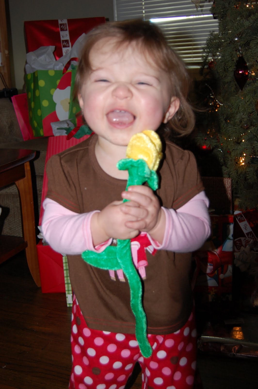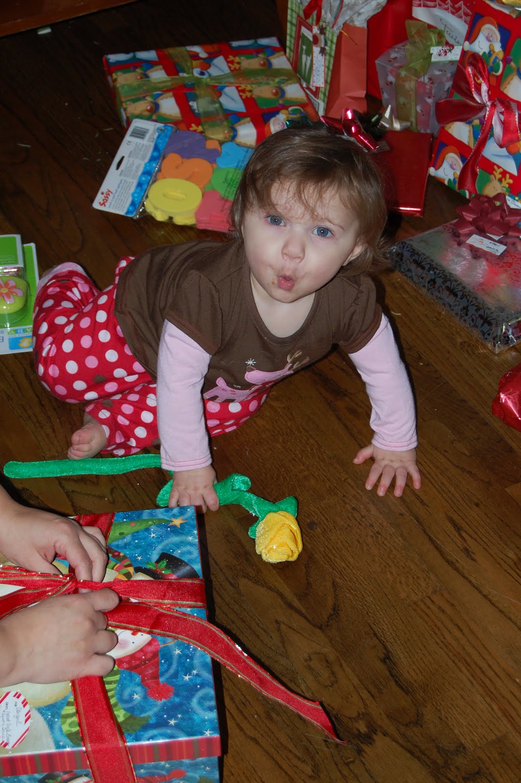 On Christmas morning, we woke up at the normal hour… around 9am. Luckily Abby is still crib bound and doesn’t get excited over Christmas yet and that means mommy and daddy can still sleep in! Trust me, we plan to enjoy this while we can. With our help, Abby made her way out into the living room to see what Santa left for us. She was very excited to look at all of the presents and get into them, but when it came to actually opening them… she lost her interest. Abby did love the toys and clothes that she got from Santa, Mommy and Daddy and her grandparents but it was the two of us that opened most of it for her. (One toy after another seemed to distract her from the task at hand.)