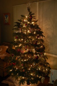 That same weekend, we also went out on got our Christmas Tree. After two years of not having a tree at all I insisted that we have a real, live tree for us to enjoy and decorate. We found it quickly and before we knew it, it was in our house ready to decorate. Unfortunatly, this decorating venture would not include Abby as she needed and nap and was too cranky to enjoy it. I am sure she didn’t miss a thing though and there will be plenty of Christmas’ to come to enjoy tree decorating time with her. So, Shaun and I spent a little quiet time together listening to Christmas music and decorating our tree. It certainly turned out beautiful.
