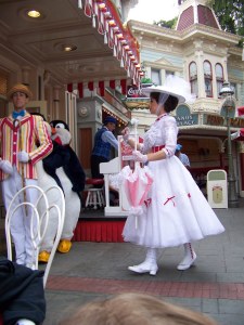 As we hit Main Street, I could see off in the distance something I knew Abby would really love. Mary Poppins, Bert and the Penguins were dancing around with the Piano Man! Once I pointed them out to Abby, she spotted them and was very excited. For those of you that didnt know, Abby’s favorite movie is Mary Poppins. Yes I know, strange for a 1 year old but she has loved it for a long time now. She can sit and watch the whole thing! We stopped to watch them perform and we got a picture from Abby’s point of view. Unfortunately we couldnt get a picture with Mary and Bert because they had closed the line, but we still had fun watching them.
