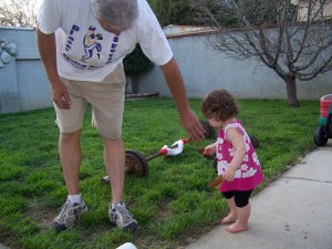 Today was a pretty uneventful Saturday… which is always nice. We get so busy during the week that its nice to not do much other then hang out together. This evening we went over to visit with Grandpa and Nana. Abby had the chance to play outside for a while and of course visit with Tommy the Turtle. After some time outside, we sat down for a lovely dinner which of course ended up all over Abby and then we sat down to watch the Kings game. Lucky for us the Kings won, so no one got hurt! Just Kidding!