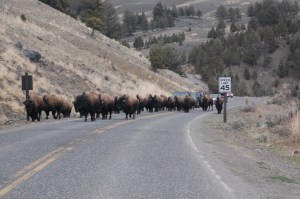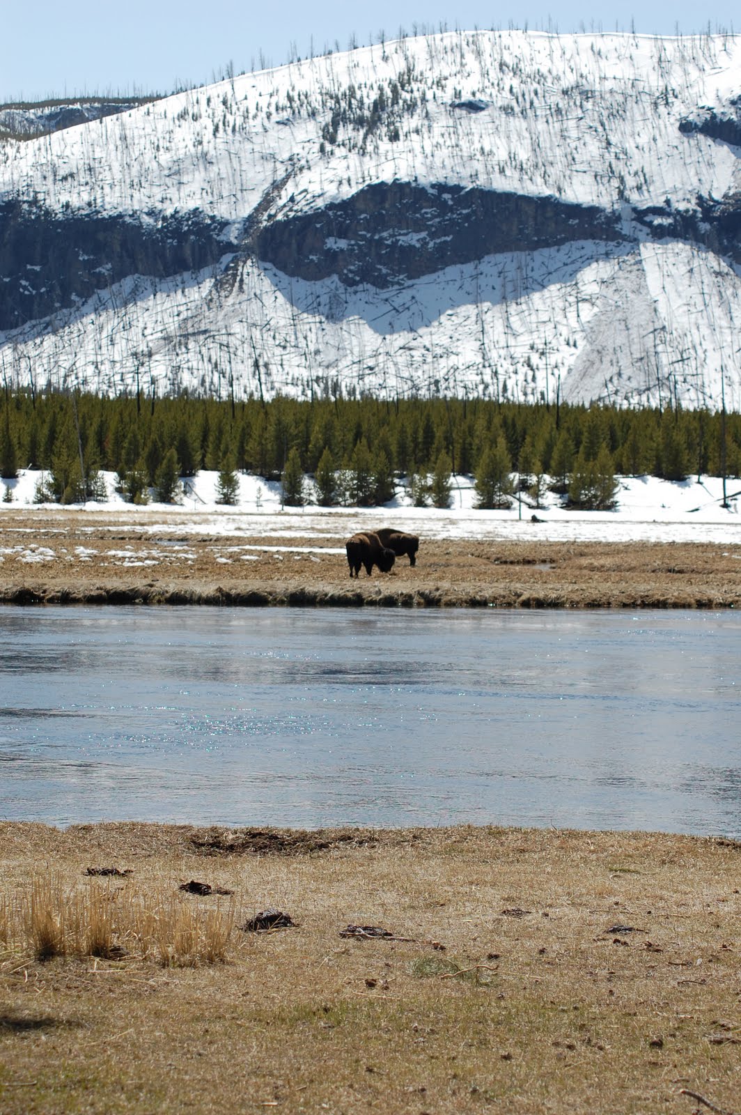 The rest of the day was spent driving and sight seeing. The snow along the Madison River at the West entrance had melted considerably and green grass was beginning to peak out. The bison were happily eating and the day was gorgeous! Even though we didn’t get to see some of the animals we had hoped to see, the drive was amazing. When we left the park I should have felt sad, but I knew I had one more weekend here and I knew I wouldn’t have to twist any arms to come back.
