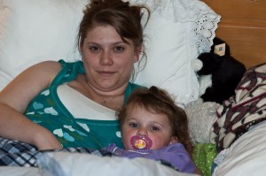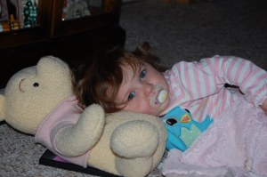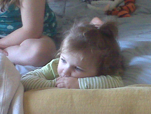 Today Abby and I did a little shopping with the family, first with Auntie Jillian and then with Grandma. While I finished getting dressed, Abby sat with Auntie J and watched some Disney CHannel. Instead of sitting or standing or running around, Abby took it upon herself to lay down on her tummy on Jillian’s bed and just veg. She looked like such a little girl laying there, kicking her feet and spacing out.