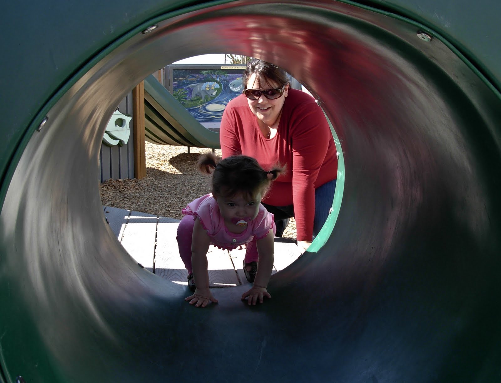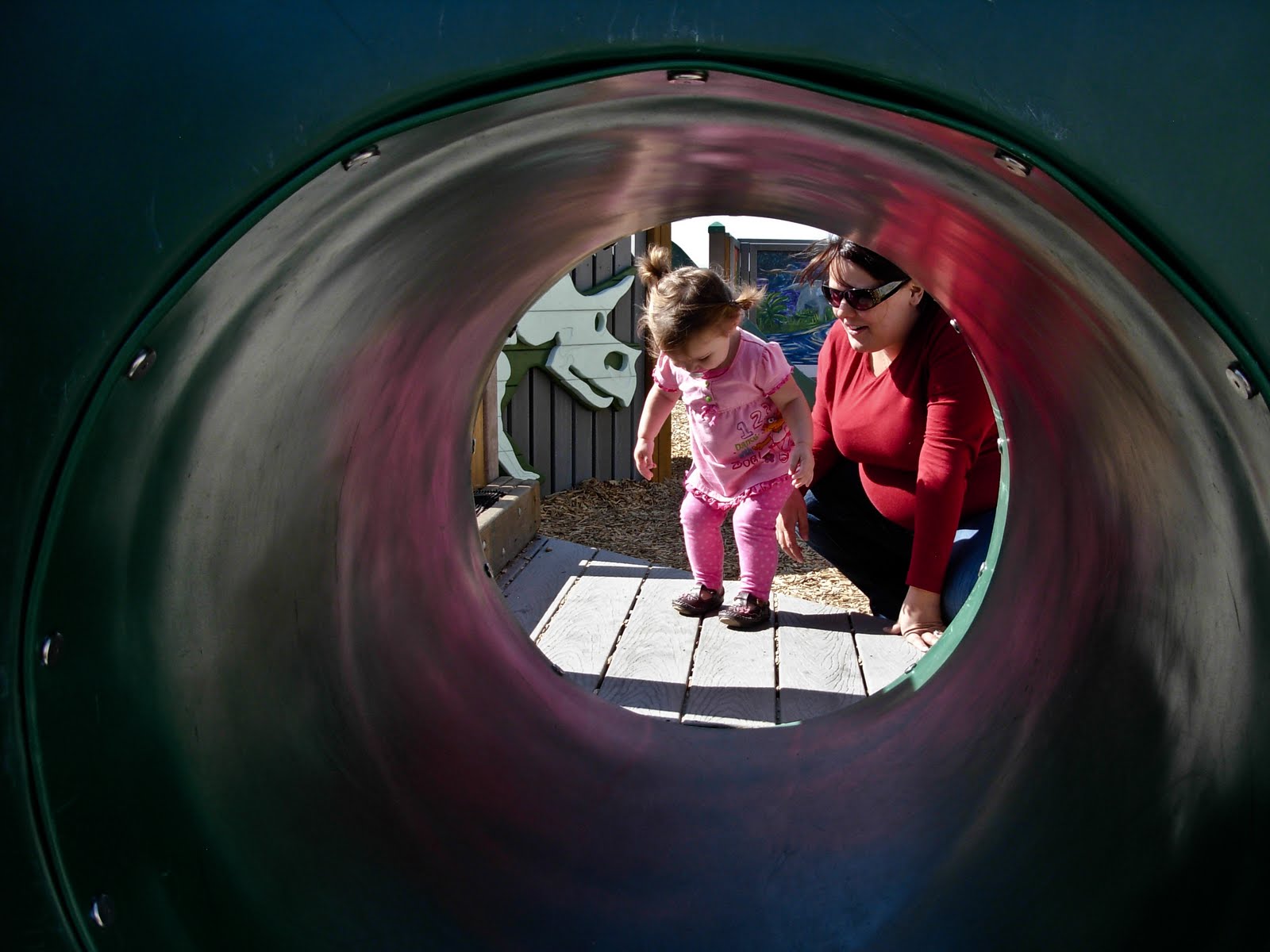 The one thing I have not been able to get Abby to enjoy are the tubes kids can crawl through. Something about them bothers her and I have never pushed the issue. Because I had someone with me, I thought I would give them a try. After a bit of calling and coaxing, Abby conquered the tubes! Better yet, she did it without having her pregnant mommy crawl through with her!