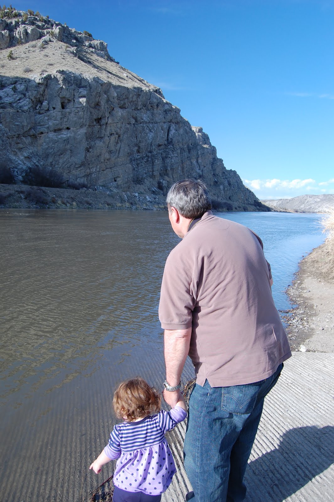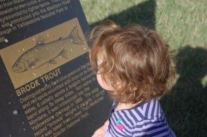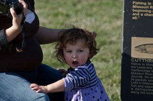 Abby loved the river and seemed determined to get right in there, but Grandpa and mommy were just as determined to keep that from happening. After throwing a few rocks and watching the trout jump we moved on to some informational boards that Abby took a liking to. Here she was able to read up about the “fishes” that call the Upper Missouri River their home, such as Brown, Rainbow and Brook Trout. OK, so maybe she cant read, but she certainly loves the pictures!