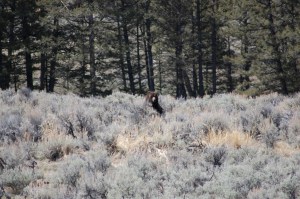 Once we entered the park, we headed out towards Lamar Valley… a popular spot for bear and wolf sightings. Our drive out to Lamar was fairly uneventful but we did see a few things from afar. We saw a gray wolf, bald and golden eagles, osprey, a marmot, bison, mule deer, elk, and river otters. We tried to get pictures of the otters playing in Soda Butte Creek, but the disappeared before we could even park the car! We drove as far as Trout Lake and then decided to turn around and head back to Mammoth.