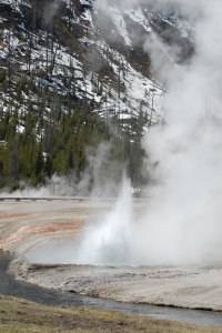 When we reached Old Faithful we took another break, stretched our legs and then got back in the car to head back to Mammoth Hot Springs again. We stopped a few times along the way for pictures. The contrast between the remaining snow, the brown of the dormant grass and the green of plants coming to life made for some beautiful pictures. It was made even better by the pendng thunderstorm that was slowly starting to roll in over the mountains.