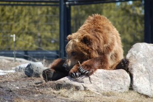 Before we left for the day, we stopped back by the bear habitat just in time to see the keepers place lunch around the area and see a new set of bears come out. The keepers place food in various spots around the habitat to keep the bears busy, both physically and mentally. When the doors opened I definitly was not expecting what was about to come strolling out. Sam and his sister Illie were orphaned as well and have lived their entire lives at the center. Sam, a Kodiak, weighs in at a whopping 1050 pounds and his sister comes in at 850. That’s almost double the size of Kobuk and Nakina, the two Grizzlies from earlier. They were impressive bears and I am glad there was plenty to separate me from them. The highlight was watching Sam try to get food out of a half frozen pond. Watching that bear put all of his weight on the ice and bounce up and down was incredible. Even more so was the sound of that ice breaking and buckling underneath him. Let’s just say it took him no more then 5 minutes to find what he was looking for. Amazing!
