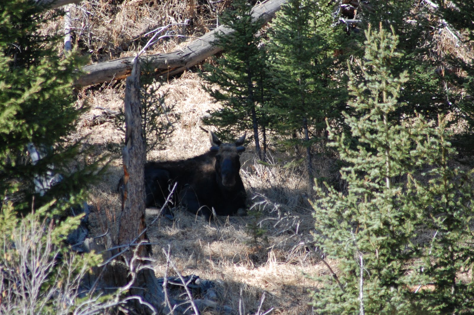 We again left early and head towards the North Entrance in Gardner. From there we made a stop in Mammoth Hot Springs and then took off for Lamar Valley. Our first stop was up the 1/4 mile road to the Petrified Tree. The road was still closed the last time we came through and still snowy but a lot had changed in less then a week. We drove up to the end of the road and as we turned around to head back my mom spotted something down a long the creek. Sure enough, after finally seeing some movement, we discovered there was a bull moose! It has been years since we have seen a bull moose in Yellowstone. The fires in 1989 destroyed much of their protective habitat and they became scarce to the average road traveler. Twenty years later, the trees they rely on for protection have grown considerably and more and more people are beginning to see them again. This big guy was hiding down in the willows and trees, aware of our presence but because no one else had come up the road, seemed comfortable with us and just laid down in the bushes. We had to watch and wait for a good 30 minutes or so for him to do this, but it was worth it. His antlers were just starting to grow back in, but he was still an impressive guy none the less.