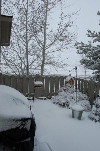 Today was a typical day that the mountains can bring in spring. We woke up to weather in the low 30’s and well, a bunch of snow… close to 8 inches to be exact. When Abby woke up, she sat at my parents sliding glass door looking onto their patio. She and I sat and watched it snow for about 30-45 minutes and watched the birds try and get to the bird feeders in the wind and snow. I have to say it was a wonderful 45 minutes. So peaceful and relaxing.