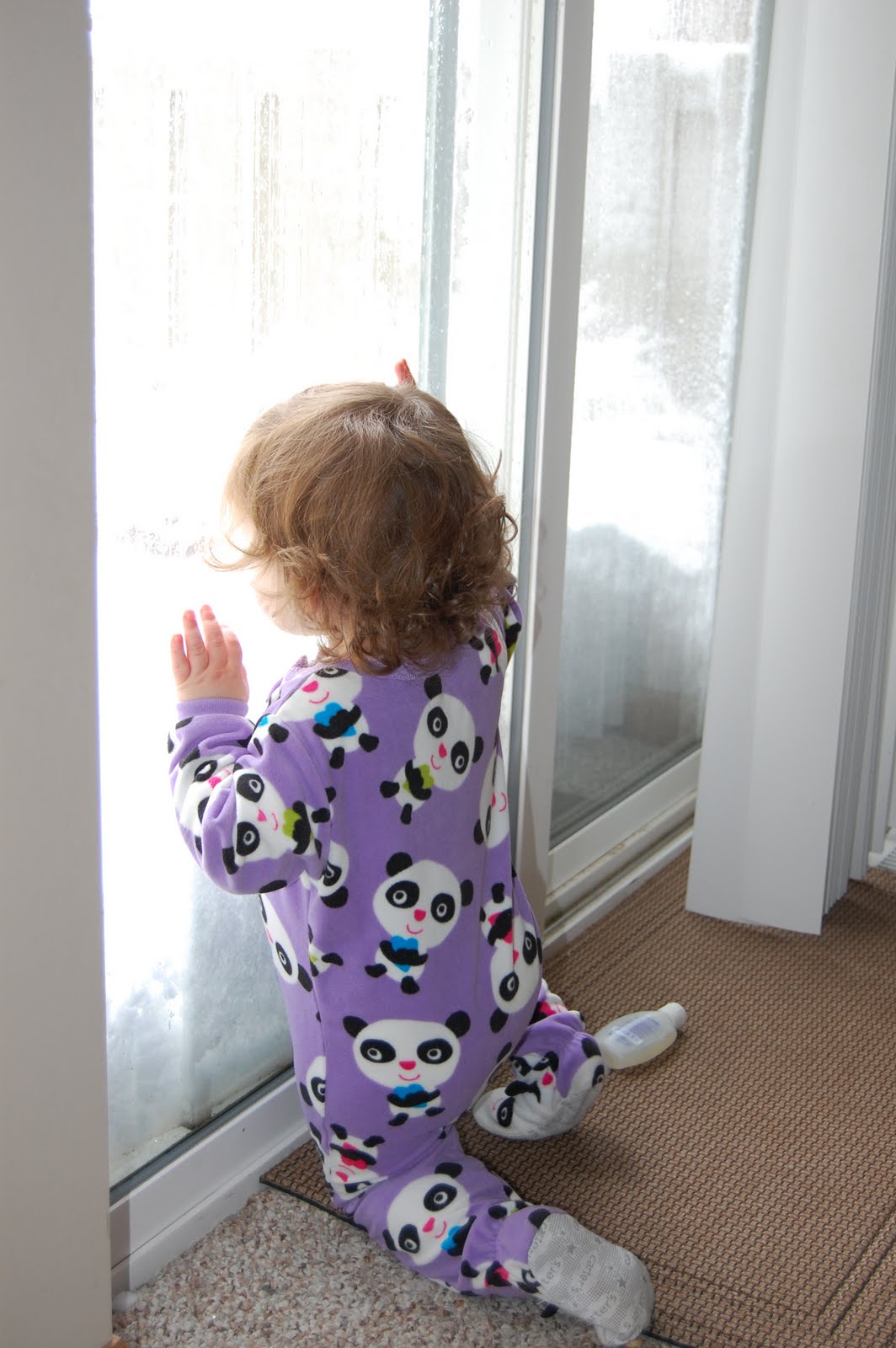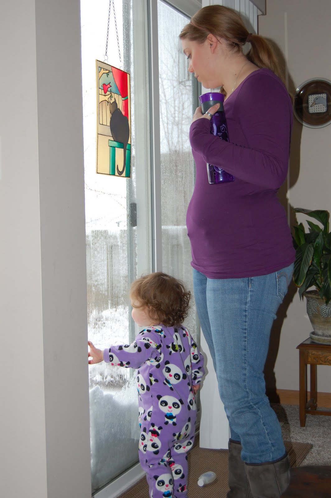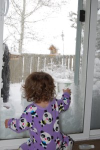 Abby, still in her P.J.’s watching the snow fall and the birds try to get at the bird houses on the porch.