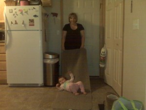 Yesterday, Abby and I went over to visit Grandma at work. Abby had a great time and met so many of Grandma’s friends at work. Abby was the life of the party and came home with a cool toy, fruit snacks and an orange. I guess people like to give you things when you are cute! That evening Abby helped Grandma clean the kitchen and certainly looked cute doing so. I apologize about the pictures, the closest thing I had to be was my phone.