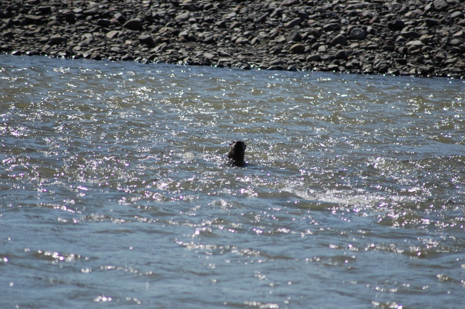 The second day of our trip was short, as Auntie Jillian had to be back for work. We headed out again toward Lamar in hopes of seeing some wolves or bears. Unfortunately, anything that was out there was too far to even be seen with the naked eye. Most people were out with high power spotting scopes looking at things way off on the hills. We didn’t leave Lamar Valley empty handed though. On our way back, I spotted the otters we had missed the day before. We drove up ahead of what appeared to be a young otter and got out of the car along the bank of the river several hundred feet ahead of him. The little otter swam and played and I was able to get a few distance pictures. He was cute and on several occasions you could hear him talking and chattering.