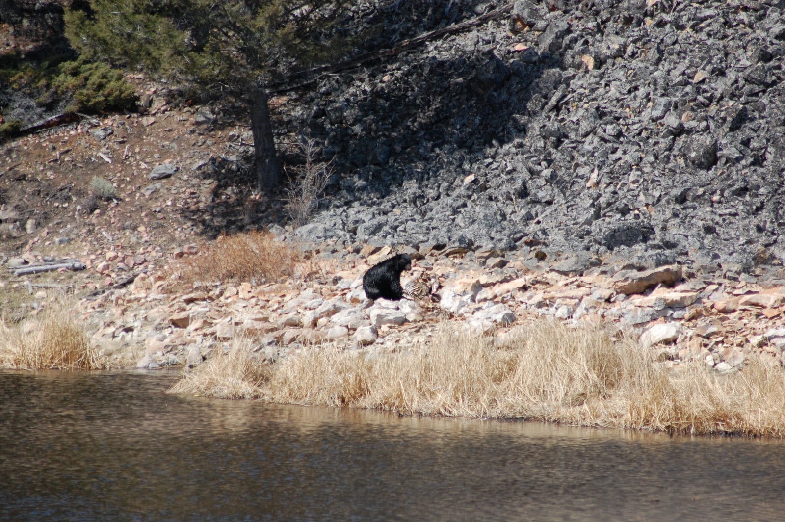 On our way back, we passed by the Yellowstone Picnic area where during my last visit we saw a little black bear. While it wasn’t the same black bear, there was one creating a scene when we came by. During the summer we would have never been able to stop, but that is one of the joys of spring. We watched this bear move along from the picnic site and beyond for a while before we decided to move on.