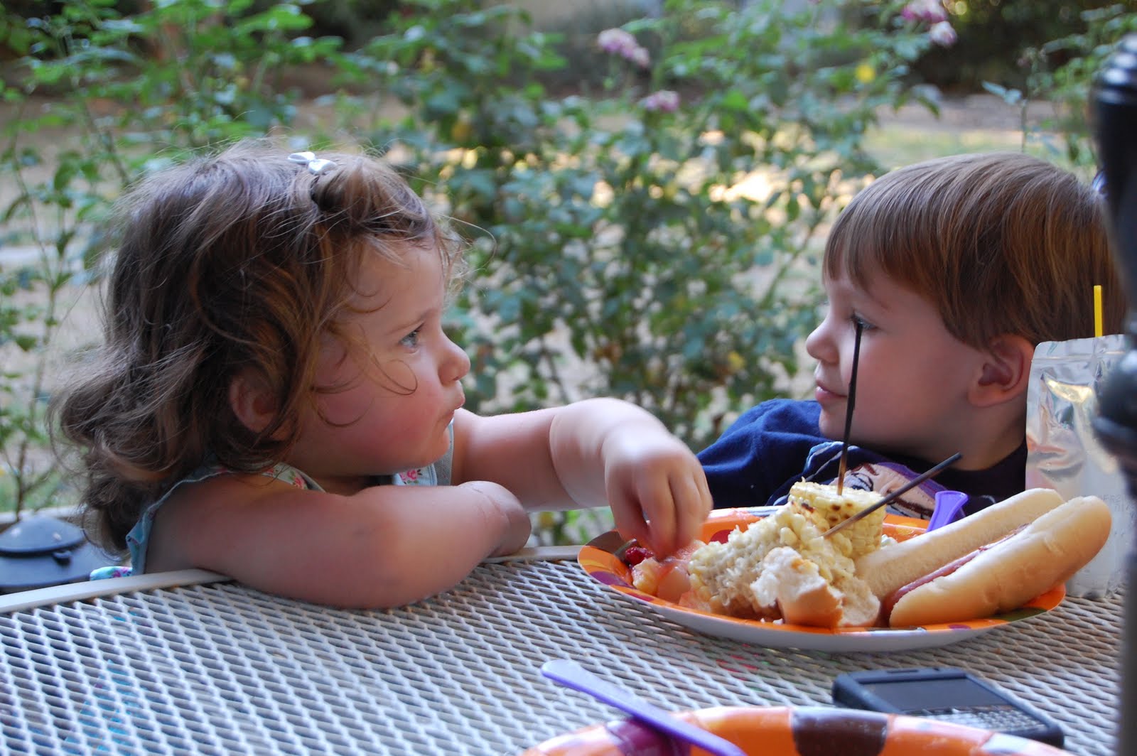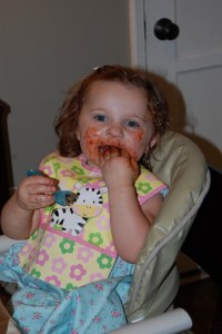 Stealing from Harrison’s plate… Im not sure that Harrison knew what to do with this aggressive little girl.The food was yummy, and the cake even yummier! I made it myself and it was certainly fun trying to do that. I have learned a thing or two for next time but I think in the end her cake turned out great. Her plates and decorations matched it… kind of. This year Abby had a great time blowing out candles and laughed hysterically as people sang Happy Birthday to her. She loved the attention understood it a little bit more. On her first birthday she seemed a little creeped out by the fact that everyone was standing around her, staring and singing. What a difference a year makes! Although her process of consuming her cake was pretty similar to last year. What a messy little girl.