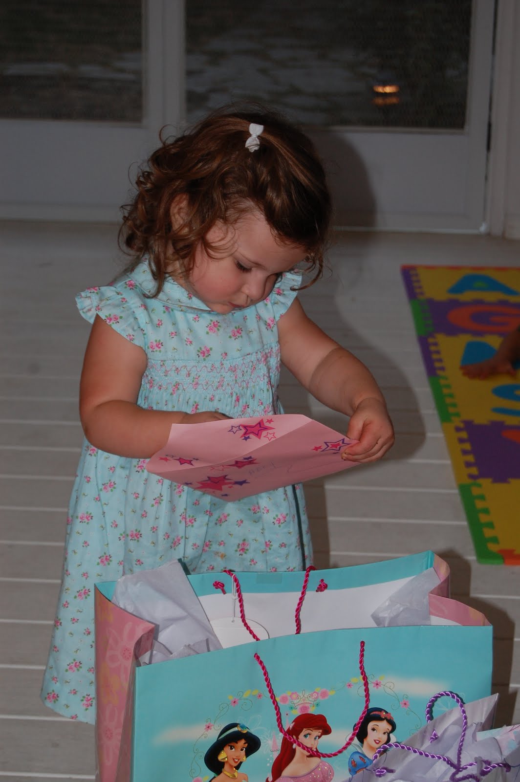 After cake, Abby opened up her birthday presents. She opened her cards, kind of and then tore through her gifts. The clothing she received was given an “OHHH CUTE!” as she opened them and of course her attention was lost on toys, wrapping paper, boxes and more. Abby is a very lucky girl and will be well dressed for that matter. What a great birthday!