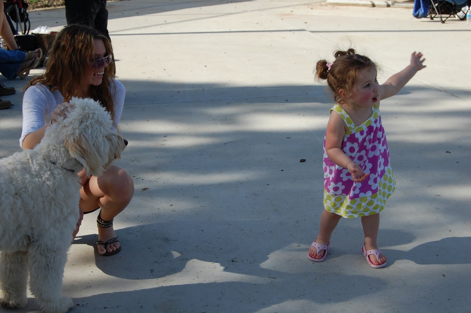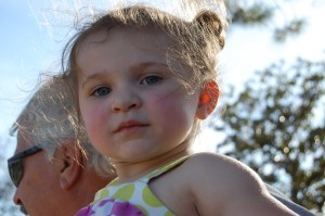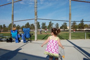 Abby, while excited to see Uncles James, had a better time running around and enjoying all that the baseball field had to offer. She met a new friend, Emma the Dog, and did her best song and dance for all to see. With the help of Grandpa, Abby climbed some trees, chased down stray baseballs, and played in the dirt looking for bugs with a few new friends. Shaun even tried to show her some tennis moves on the empty courts nearby. She loved it so much that when it came time to vacate the court for a few serious tennis players, Abby let most of the people within a mile or two know that she was not happy to leave.