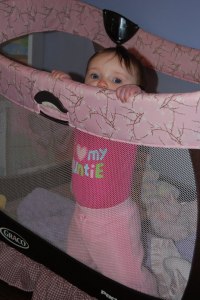 Ellie smiles and giggles a lot, but Abby is generally the one who can get the most laughs out of her. She moves like crazy and is pretty much into everything that she can get to. Ellie is pulling herself up and standing, often times onto things mommy wishes she wouldn’t climb on to. I have a feeling that I will have to pull out the play yard, AKA “the Prison”, very soon in order to keep my sanity. Ellie is a strong little girl with an even stronger will, just like her sister. I know our girls will keep us on our toes as time marches on, but I look forward to every moment of it!