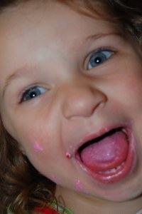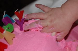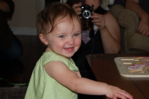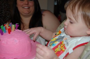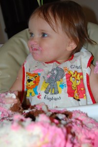 Birthday cake time was a blast. Ellie wore her birthday hat, well… just for a moment. When the cake was first brought out, Ellie went straight for the candles and of course looked around at us like we were nuts for singing. We werent that bad! But once the candles were blown out it didnt take long for Ellie’s fingers to find her way to the cake. Once she realized that it was ok to tough the cake, she was all over it. It didnt take long before the cake was demolished and all over Ellie. Abby, Emily and Harrison helped a little too and snuck a taste when they could.