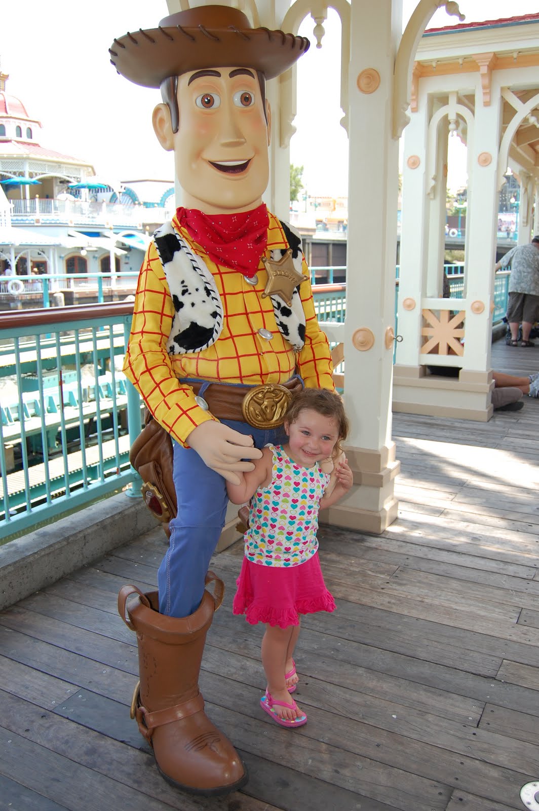 Sitting down with our water misters and fans, Jillian and Drisana took off to ride California Screamin’. As we waited two of Abby’s favorite characters made an appearance… Buzz and Woody. Buzz had to leave but Abby did get him to give her a high five. Woody stuck around though and she had the chance to take a picture with him as well as talk to Woody. Im not sure what she talked about, but she was certainly cute about it.