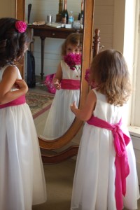 The beautiful bridesmaids and one flower girl stop for a photo op before the ceremony begins. Abby had not yet arrived but we were lucky to have Sophia with us!