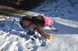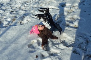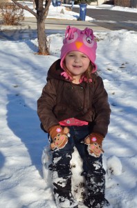 During the day Abby and Ellie watched movies and played. When Ellie took a nap, Grandpa took Abby outside to play in the snow. She had a great time, rolling up snow balls, making snow angels and enjoying what was left of the snowfall from a few days ago. She even sat and what was left from their snowman for a picture. I good day was had by all, that’s for sure!