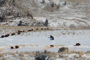 The unseasonably warm weather did keep many of the animals away though. So no wolves for me this year. We had been told about several animal carcasses that the wolves had been frequenting for food but to no avail. We did see the usual bison throughout the park and even a long trail of them heading out to Hayden Valley. We also had the chance to catch two coyotes trying to catch mice in the shallow snow and grass.