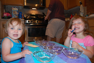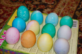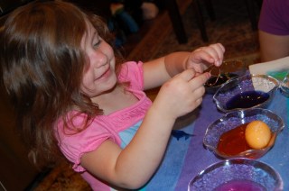 Ellie seemed to enjoy using blue and green on most of her eggs, while Abby stuck with purple, orange and yellow and pink. At least they covered all of the colors so that none of them felt left out! Abby was very much intrigued by the wax crayon as well. To her it was amazing that she could draw all over the egg and not see a thing but when she placed it into the dye she could see all of her art.