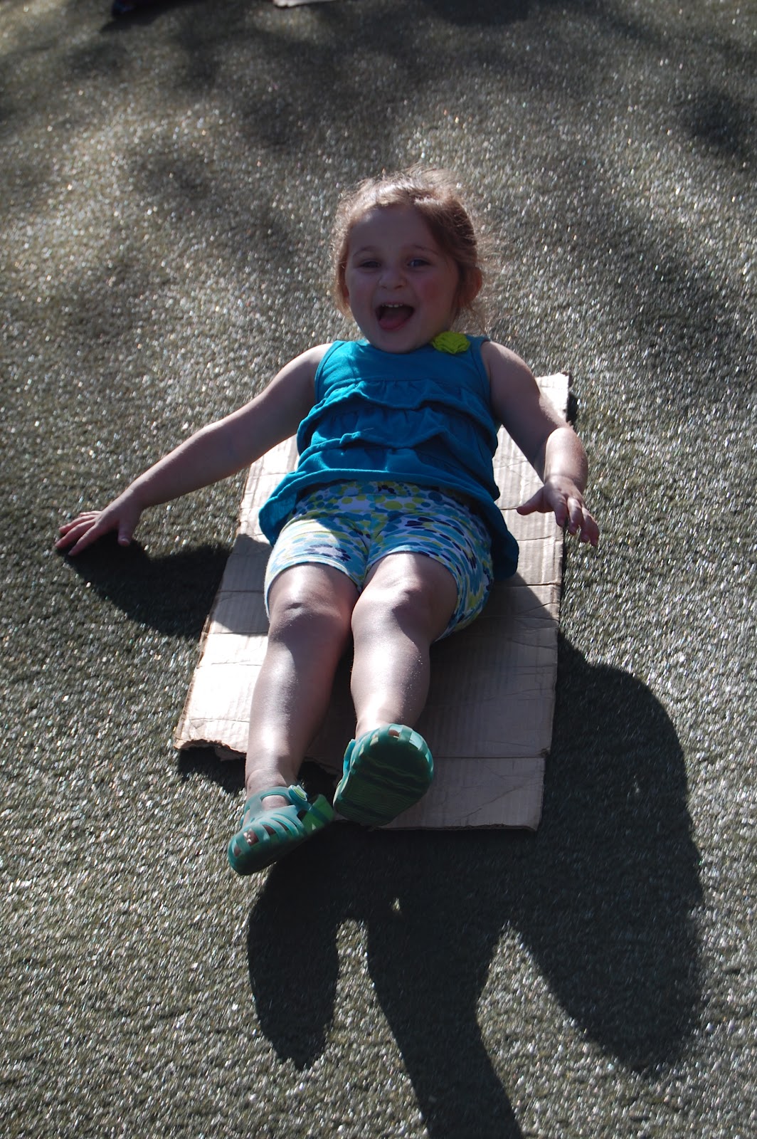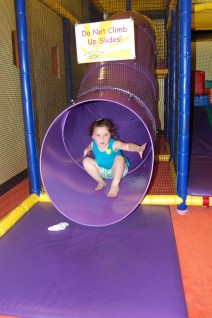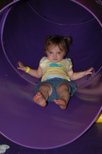 Taking on the slide. Abby jumped up the minute she hit the bottom, just at the opening and flew out just so she could go again. It was quite a site to see.
