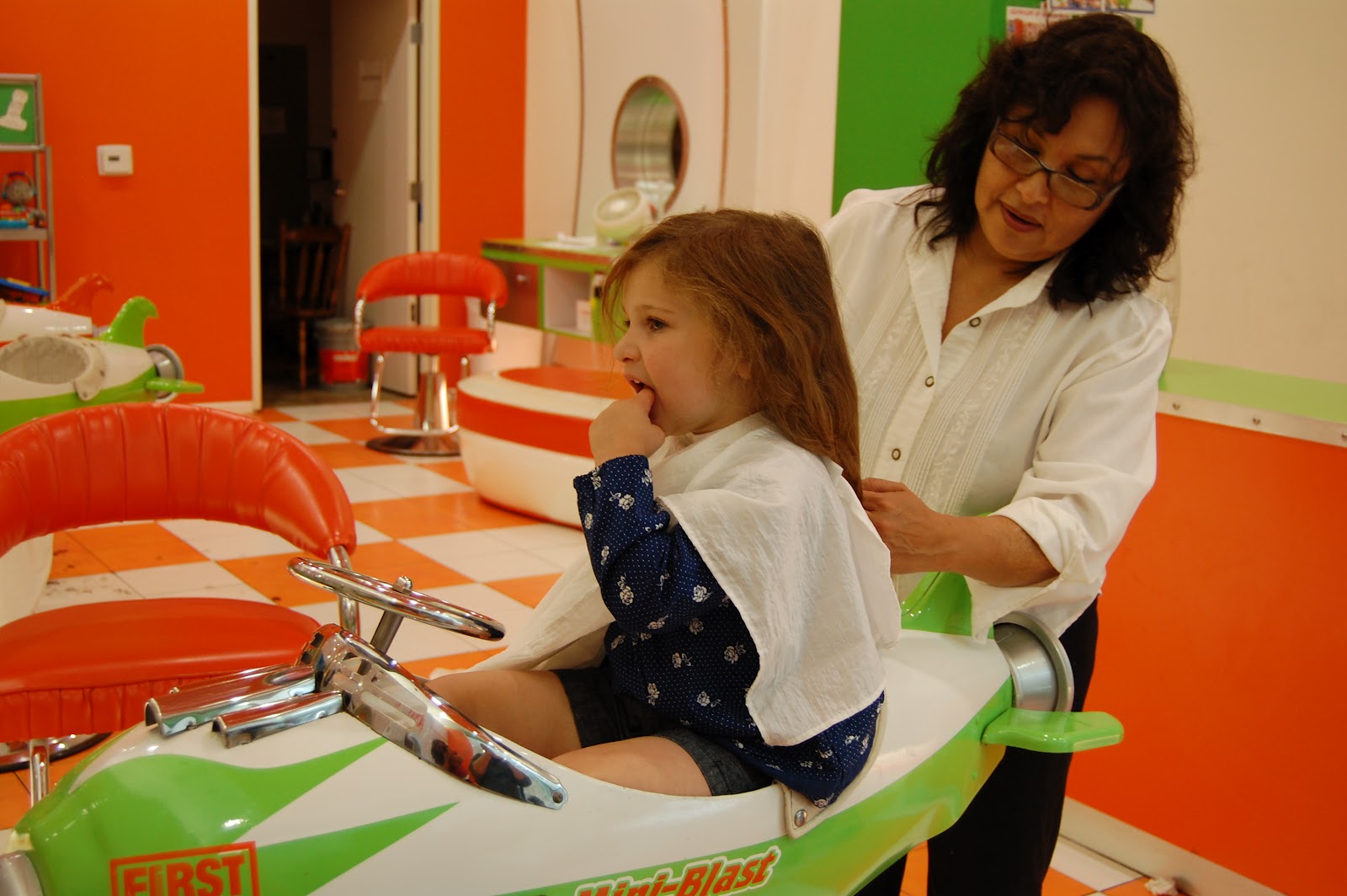 When we arrived, Abby seemed a little apprehensive of what we were about to do. But, she relaxed when she got to sit in her very own rocket ship chair and pick out a movie to watch. She chose Finding Nemo. Being a pro at this sort of thing, the lady who cut Abby’s hair got right to it. She wet down her hair and before I knew it… SNIP! The first cut had happened! I felt myself getting emotional but I knew tears would upset Abby, who was worried it would hurt, so I kept it all in. Her little curly locks were now in an envelope for me to keep and all over the floor. The stylist snipped and shaped and Abby sat perfectly still. She kept her head tilted when asked and didnt argue one bit. Quickly it was over and Abby’s hair was about 9 inches shorter then when we first walked in. With a lollipop in hand she was as happy as a clam and already telling people she got her hair cut. Ellie got a little trim too, but that was mostly because the stylist wanted her to feel included.
