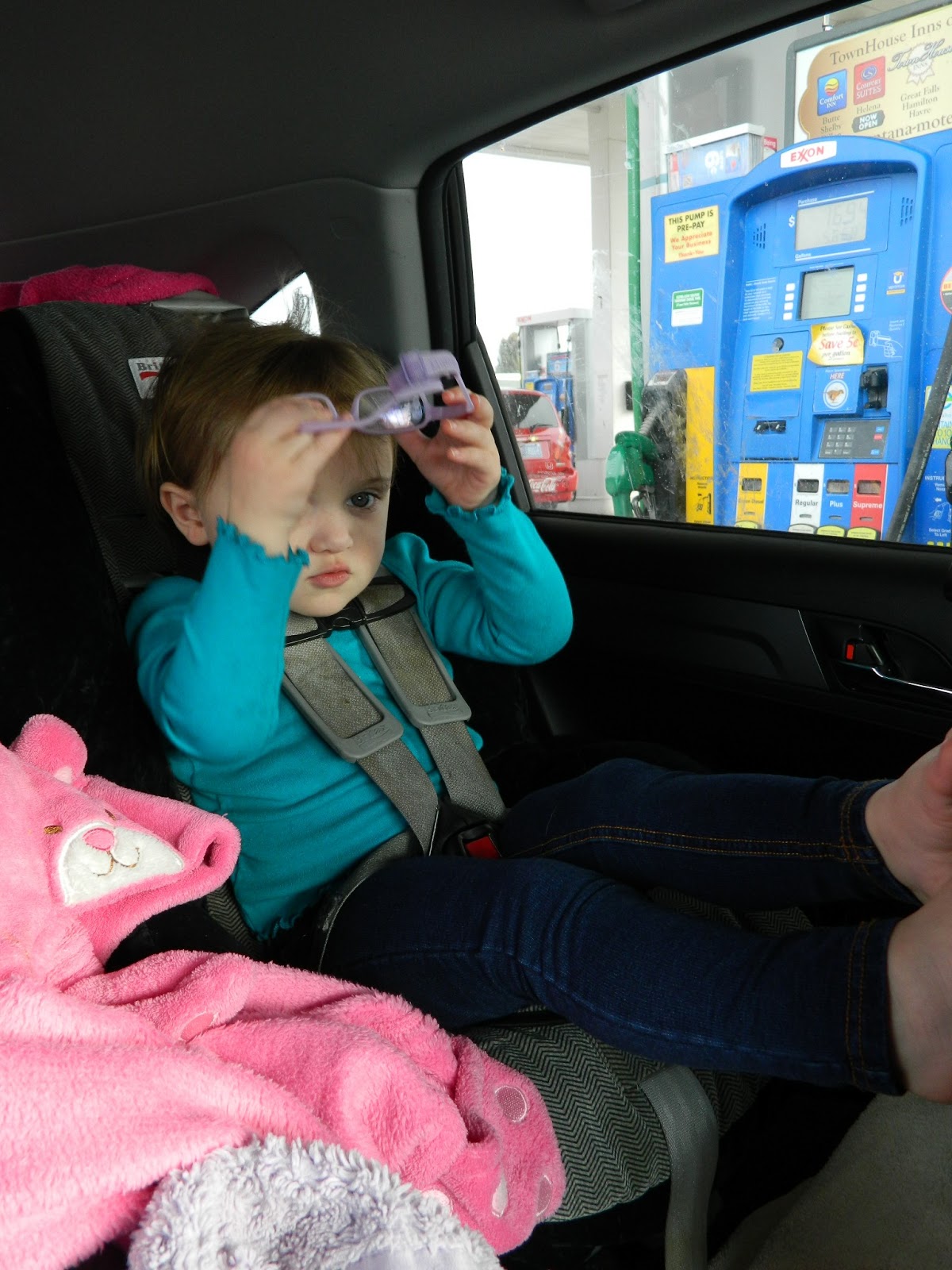 | In the car, stopping for gas and heading our on our way! |