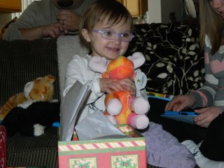 | Great Grandma Laura opening up her present from the girls. |