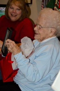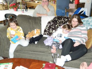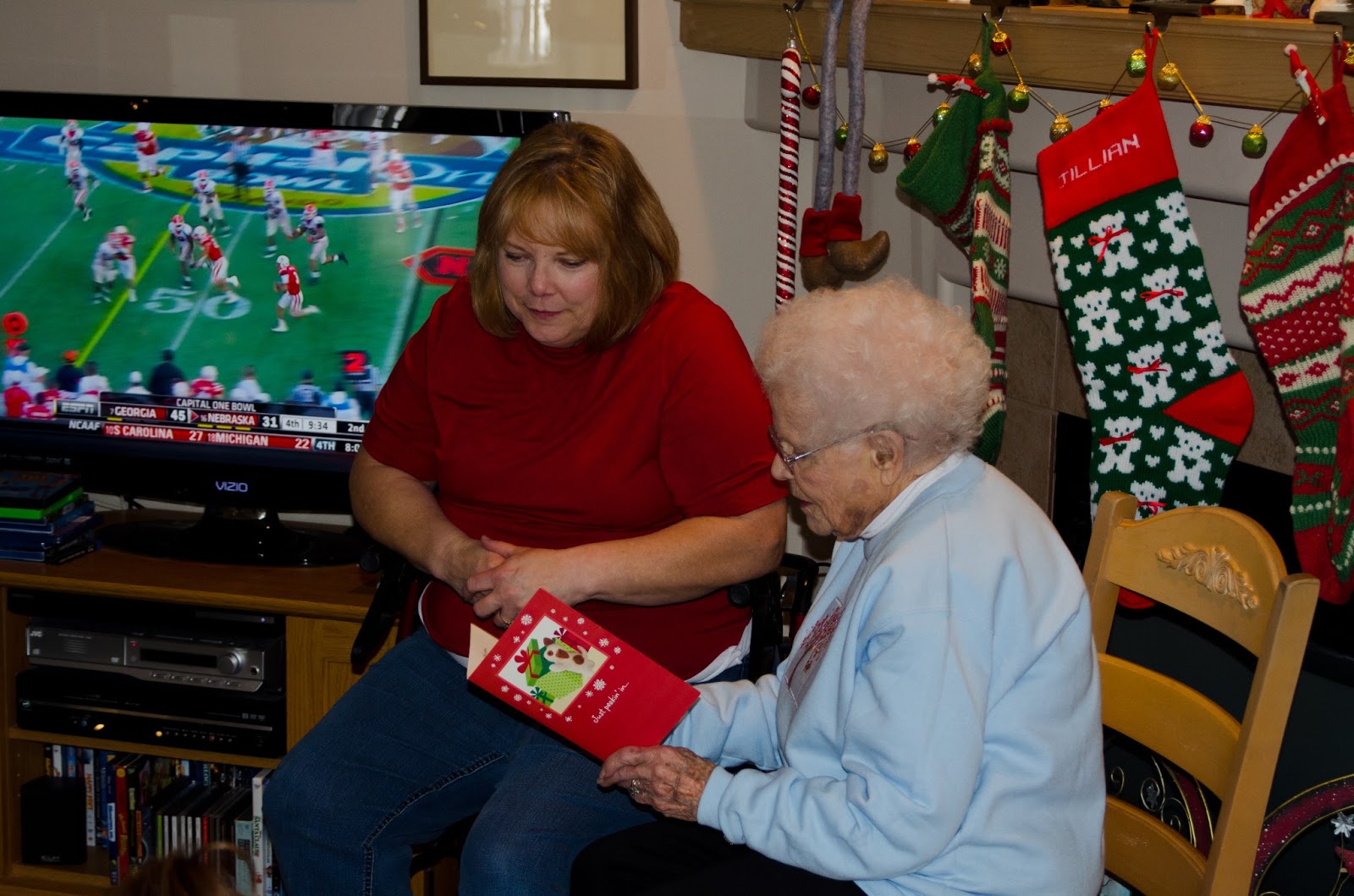 | Opening presents with Great Grandma Laura. Sorry about the game on TV Shaun. Just pretend the score isn’t visible. |