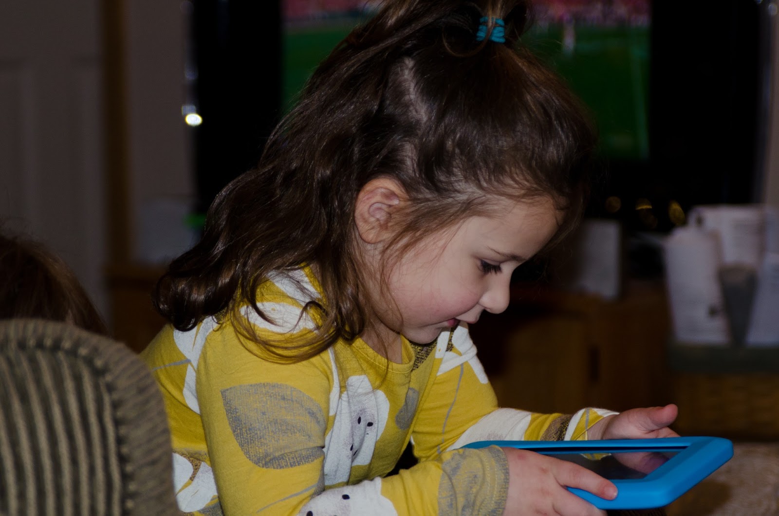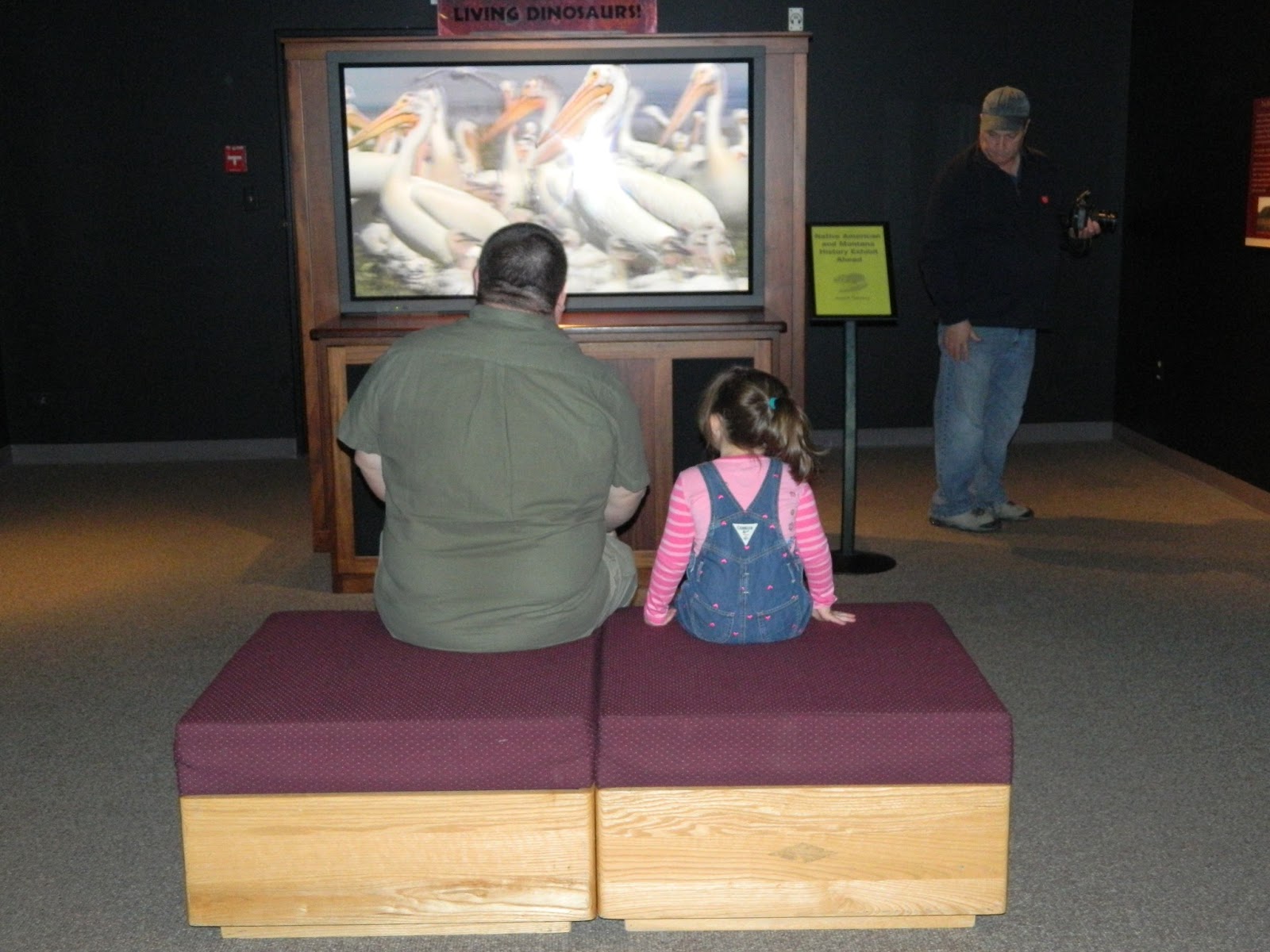 | Abby and Daddy watching a video about birds and their connections to dinosaurs. |