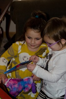 After brunch we sat down for another belated Christmas and opened presents from Grandpa Prueter and the gang. The girls loved their presents! They each received a tie-dyed stuffed moose and new pillow cases and a doll that keeps the monsters out from under the bed. However, in true child fashion, the hit of the day were their cards from Diane and Barry. Nothing beats a card that sings and dances! I think those will be hidden in a box on the way home.