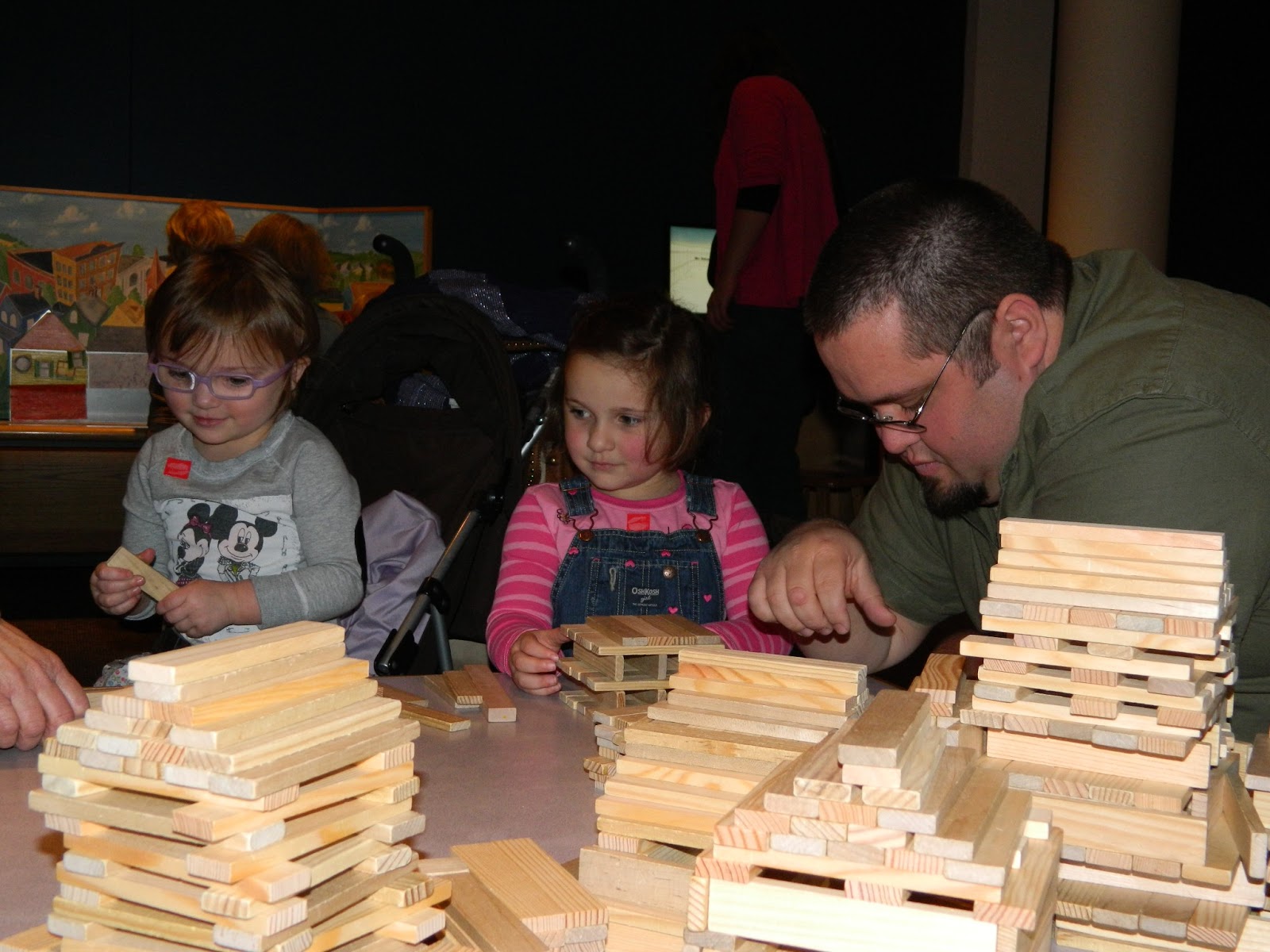 After the play area we headed out to see some of the new exhibits. The first was all about building and engineering. At the front of the exhibit was a low table covered in wood building pieces. Museum patrons were invited to add on to the structures already created by others or start one of their own. Abby, Ellie, Daddy and Auntie Jillian did just that and had a blast doing so. Shaun’s structure looked pretty cool by the time he was finished with it.