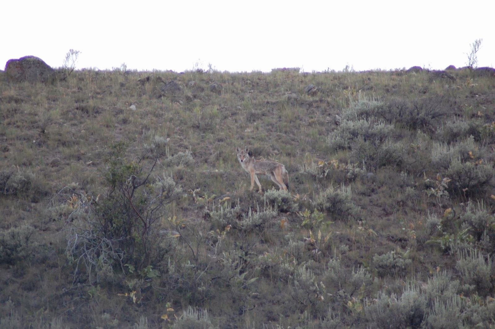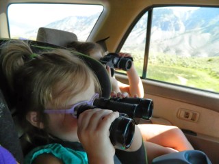 On our way through the narrow, one way road we spotted a young bull elk getting an early start on his harem of ladies. Then Abby started yelling that she saw something. At first we thought that she was being silly because she had been using the binoculars to spot Grandpa Jerry. But she was being serious. Her sharp little eyes found a lonely coyote walking along the hillside. Neither Grandma or Grandpa or mommy had seen it! She spotted her first animal all on her own! What a way to end the trip through Yellowstone.