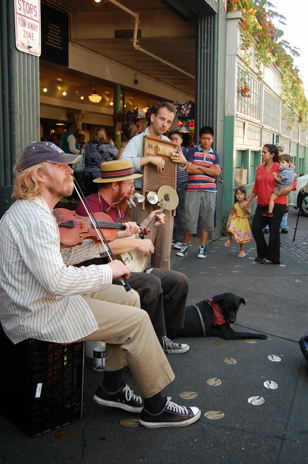 We walked along the street hoping to get inside the market area and check out all of the shops and produce, but after making one attempt at it, we quickly decided just to walk along outside and enjoy the afternoon. It was too crowded within the market to try and keep track of 3 adults, 2 children and a stroller. Another time I guess. We attempted to watch the famous fish throwers too but alas that was overly crowded as well. We did have the time and space to watch a a great little bluegrass band playing on the street! They were great and even had a album to buy, pretty good if you ask me. Abby and Ellie even had the courage to put some money in their case too! Abby had a little help from Grandma because of the dog, but she was still very brave.