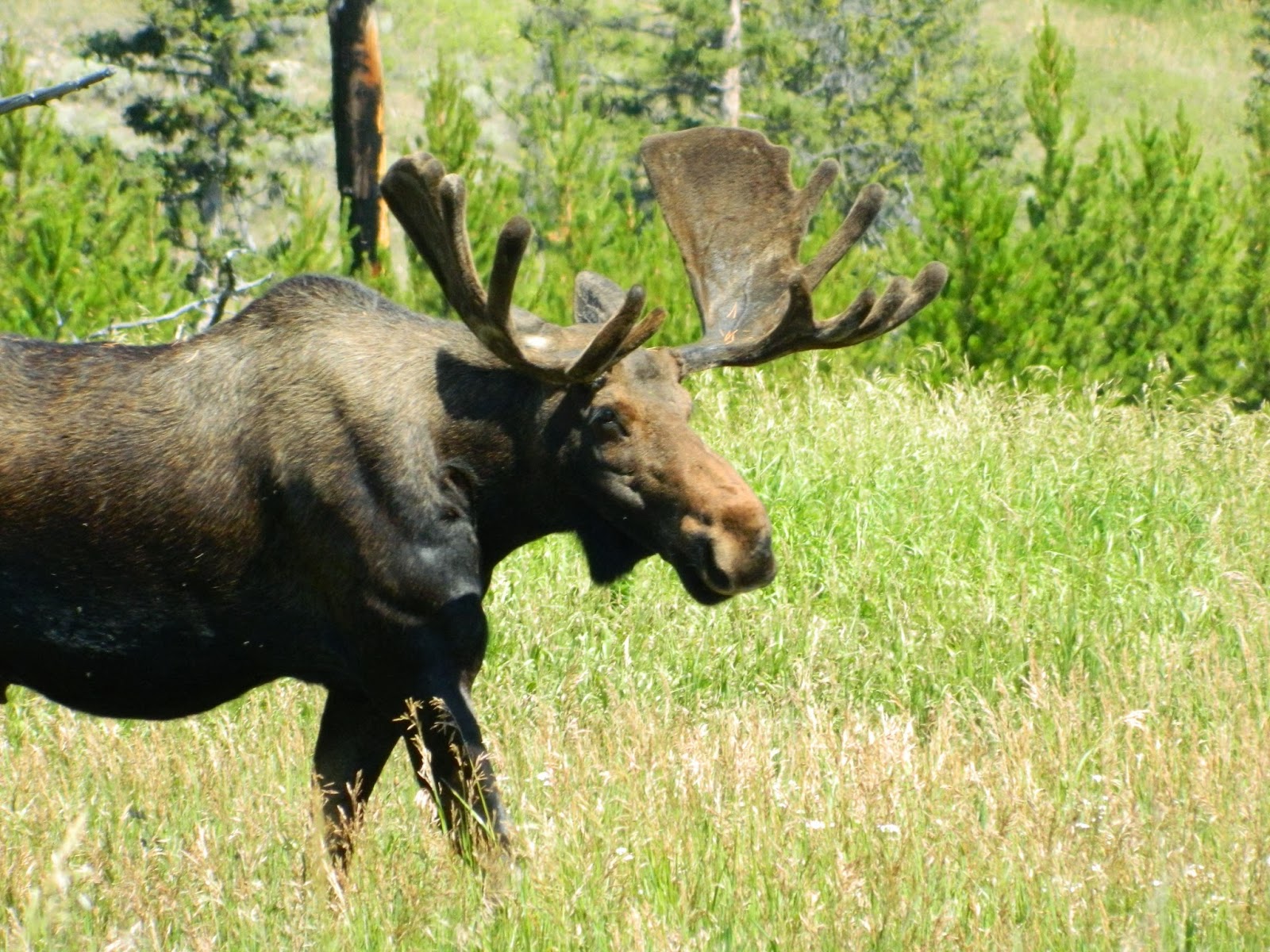 A very small group of people had stopped just off of the road near an open field. We were stuck behind a small hill but got out of the car to see what was going on. Just as we made it to the top of the little hill we saw the big bull moose, sauntering across the field. He was less then fifty yards away but well within a safe a difference from us. It has been a long time since we have seen a bull moose and this close too! He seemed content with us nearby and just went about his business walking through the field and up into the trees. We hopped into the car and drove further up the road to a pull out near petrified tree. From there we pulled out our binoculars and watched the moose head to a small meadow. He took his time there, eating and drinking from what must have been a small stream or pond and then decided to lay down for a late morning snooze.