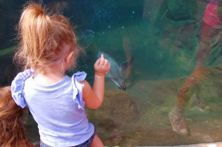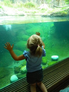 This particular penguin seemed very interested in Ellie. He or she kept swimming up to the glass right in front of her. Of course Ellie loved every minute of it.
