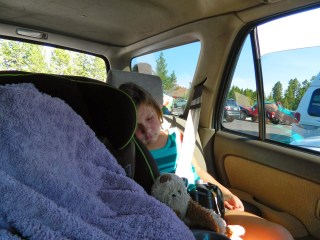 Lots of fun, sunshine and mountain air makes kiddos tired. I know someone else who used to cover herself with a blanket in the car.