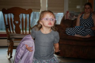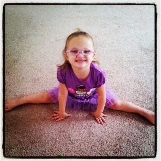 While we wait to find the right couch for us, the living room has a lot of open space. Abby and Ellie use it to dance around, sing and just have a good time. Today I found Ellie practicing her “stretches”. My that is one flexible little girl. I am thinking dance may just be the hobby she loves!