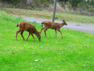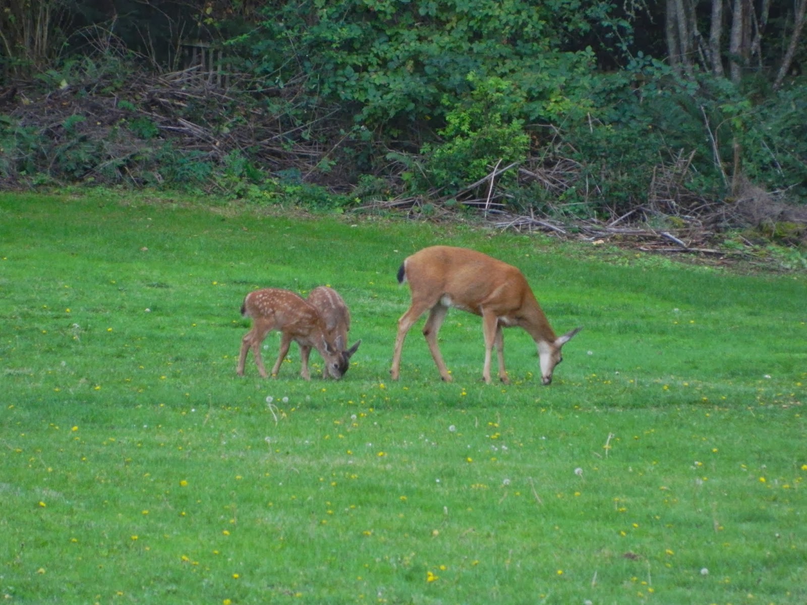 | A doe with her two little babies came out of the woods into some of the grassy areas for the evening. The little ones were still young enough to have their spots. |