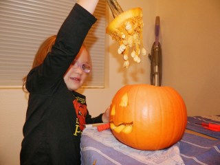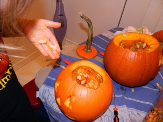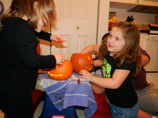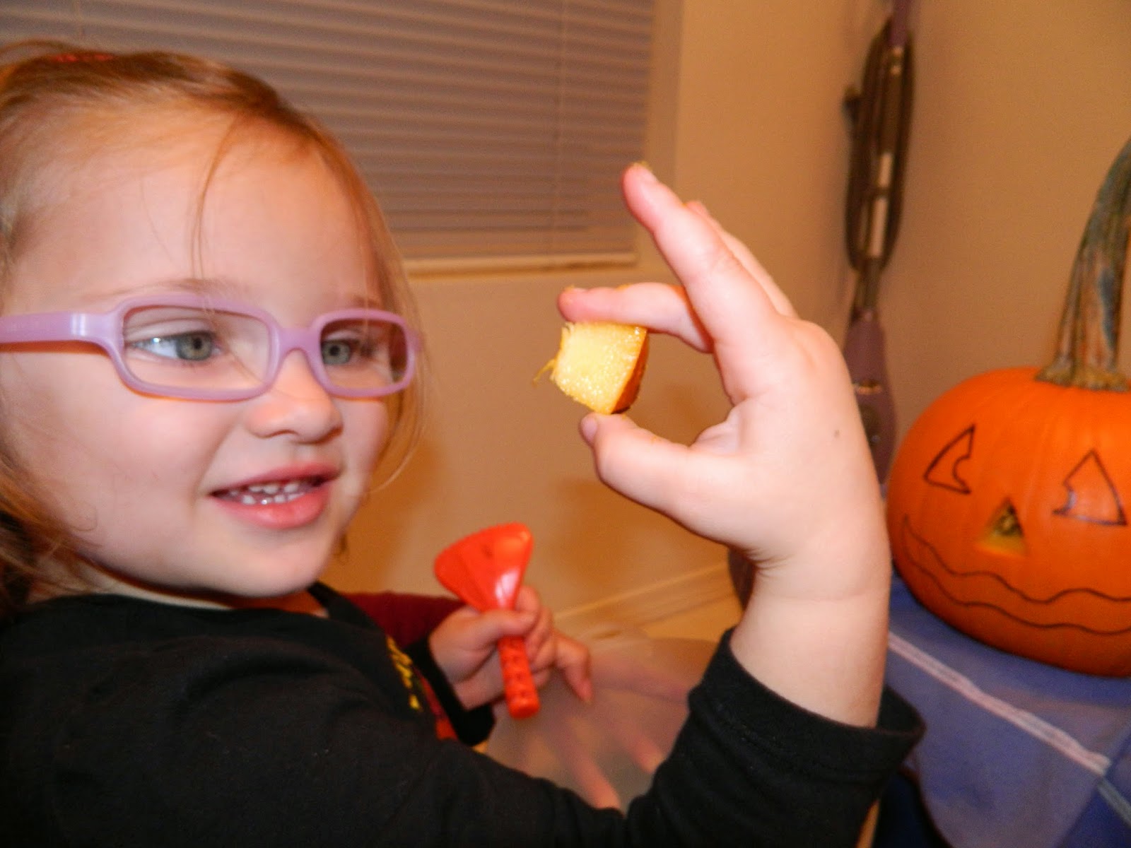 Daddy is helping Abby get the pumpkin pieces out. Their pumpkins were super ripe and juicy which made cutting the pumpkins a bit tough for small hands.
