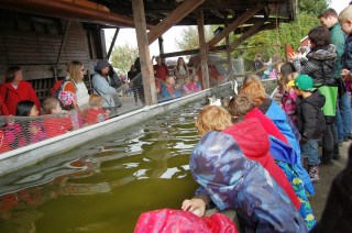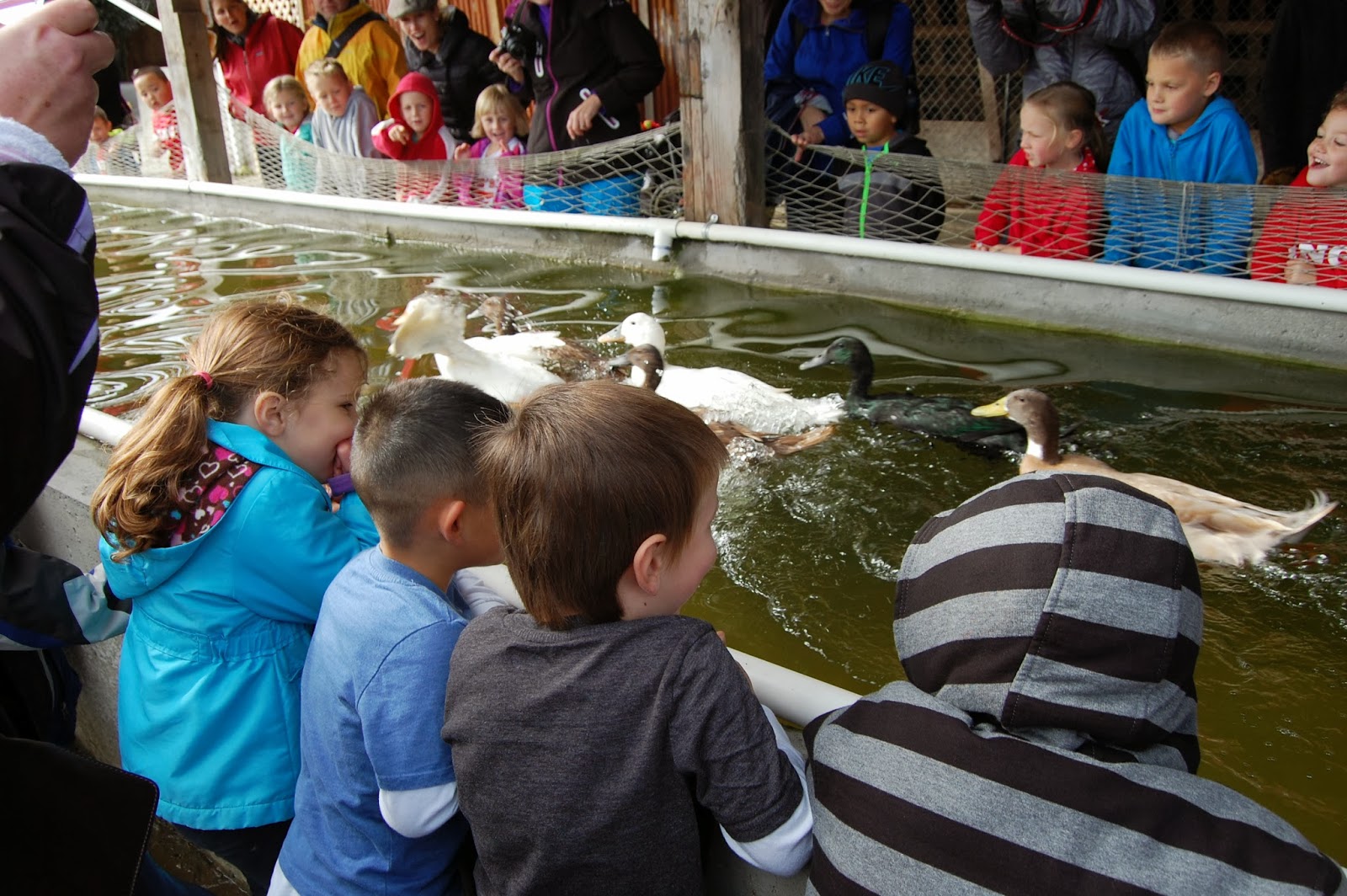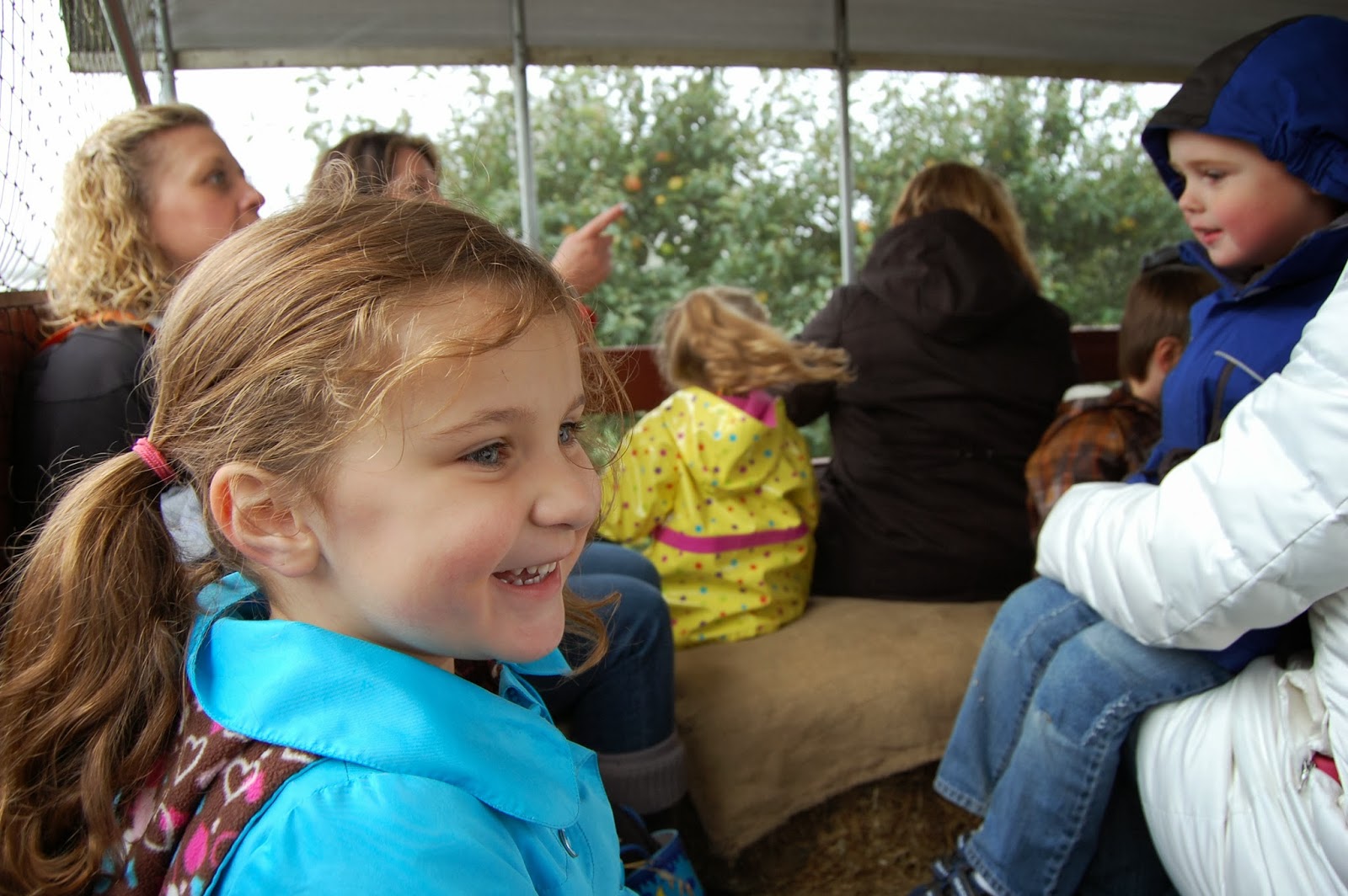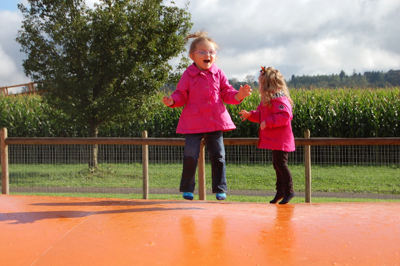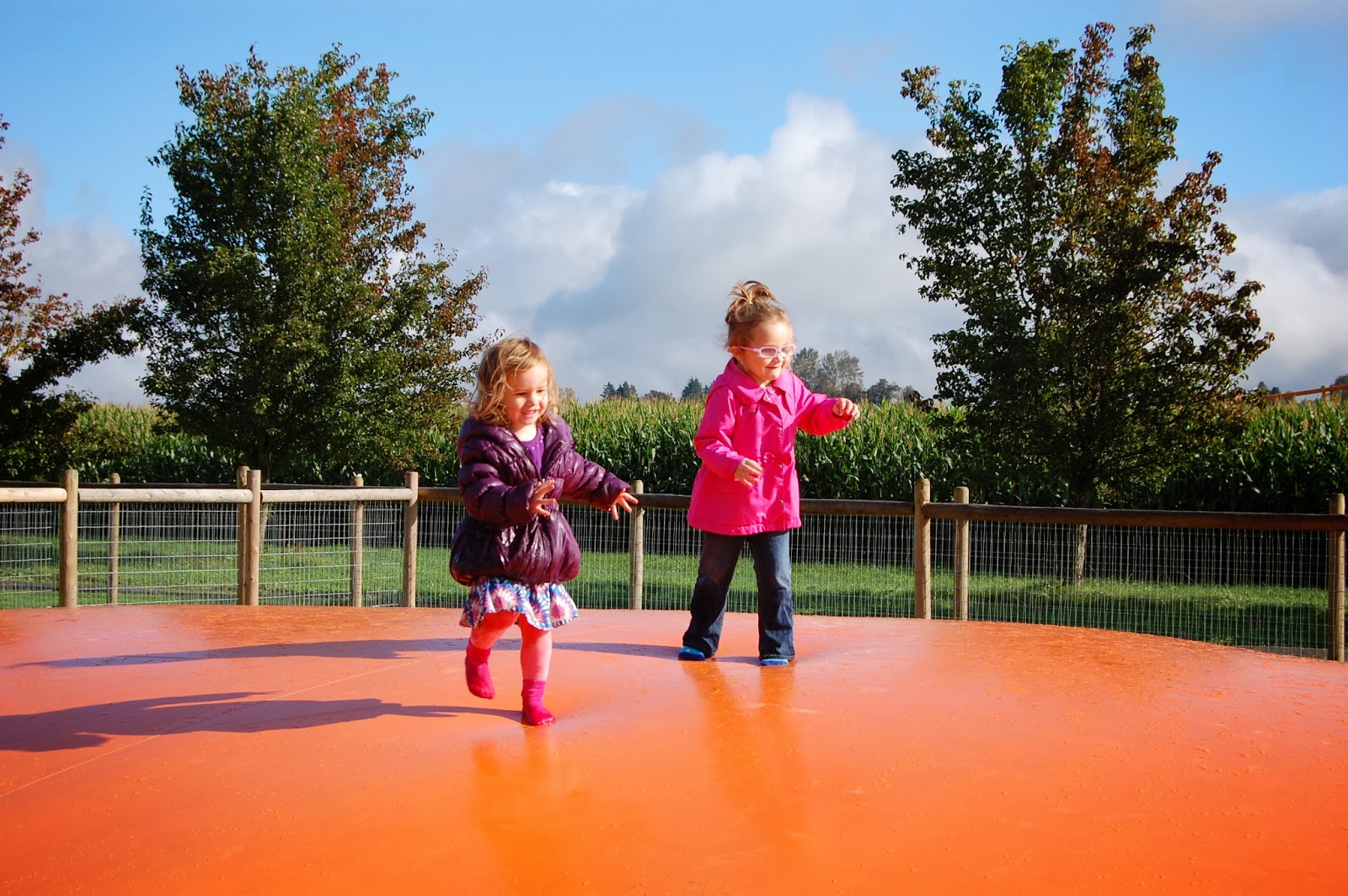 While the class waited to ride the tractor out to the fields to pick pumpkins, they were given the chance to play on the “bubble”. Because of the rain the night before, the bubble was wet and slick but that didn’t stop the kids from having a blast. Ellie and Edie bounced and giggled and had a grand time.