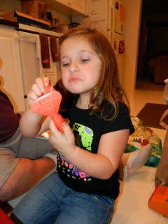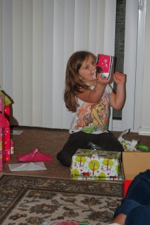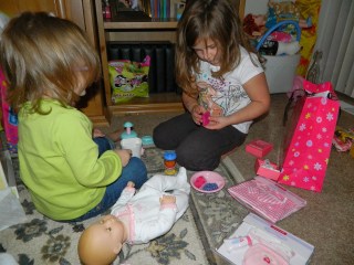 Playing Bitty Baby’s in the midst of opening presents with Grandma Denise and Grandpa Jerry  the weekend following her birthday. (Yes, that would mean I technically have seen into the future or just added this picture at a later time. You choose the one that sounds better.) I barely took pictures the night she opened Bitty Baby and this is the only one I have of her playing with it.