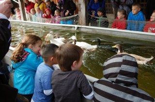 And they finally pass by. The white duck in the lead, named Aflac, is the one Abby chose. He won!